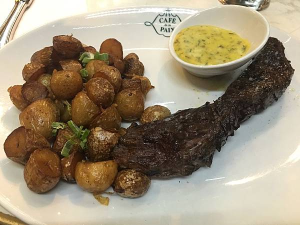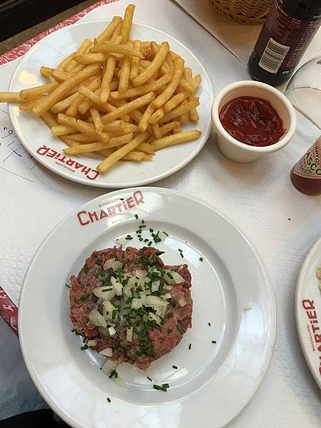 主菜:吃了頭好壯壯的招牌菜生牛肉(法國人認真愛吃薯條)
